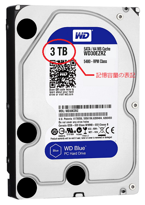 そのHDDの記憶容量がどれぐらいあるかは、HDDの表面に張り付けてあるシールに記載されています。(図6の場合は、3TB)