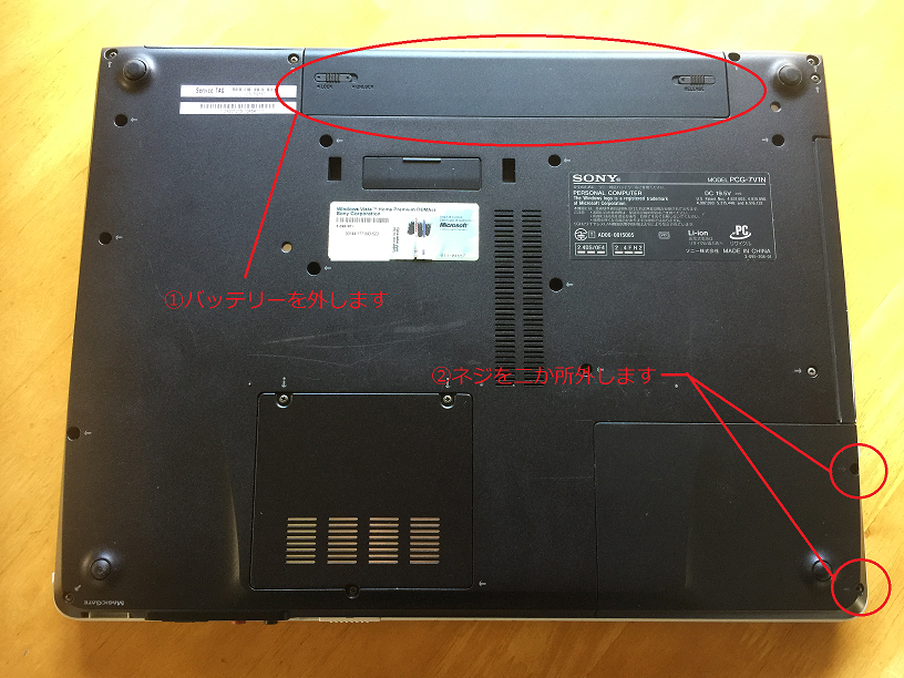 3.再びノートパソコンをひっくり返し、HDDが収納されている部分のふたを外します。(図1の②)このSonyのノートパソコンの場合は右下部分で、プラス(+)ネジ二か所で止められていました。(HDDの収納位置は、そのパソコンによって違っています。中には完全に分解しないと取り出せないものもあります。HDDの収納位置については、インターネットの検索に“型番+HDD交換”などのフレーズで検索すると大抵のものは見つかります)