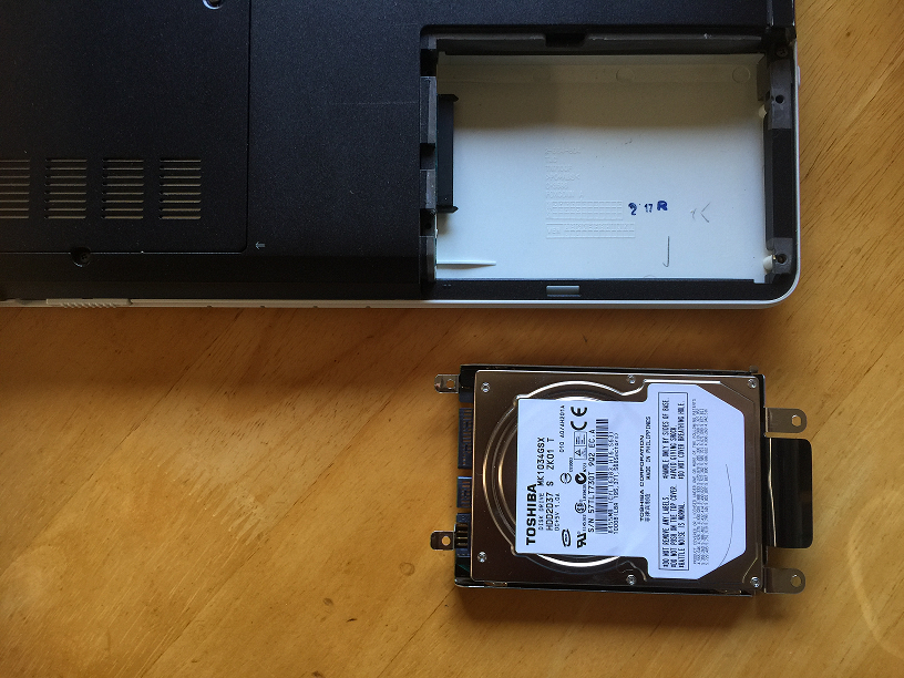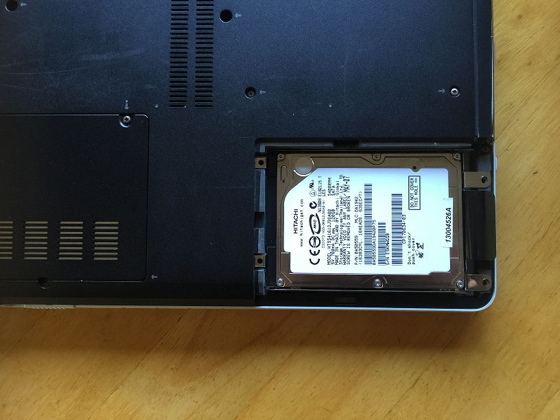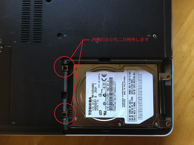 こんな風に、ノートパソコンのHDD交換は、完全分解しないと取り出せないものを除き、比較的簡単に交換することが出来ます。