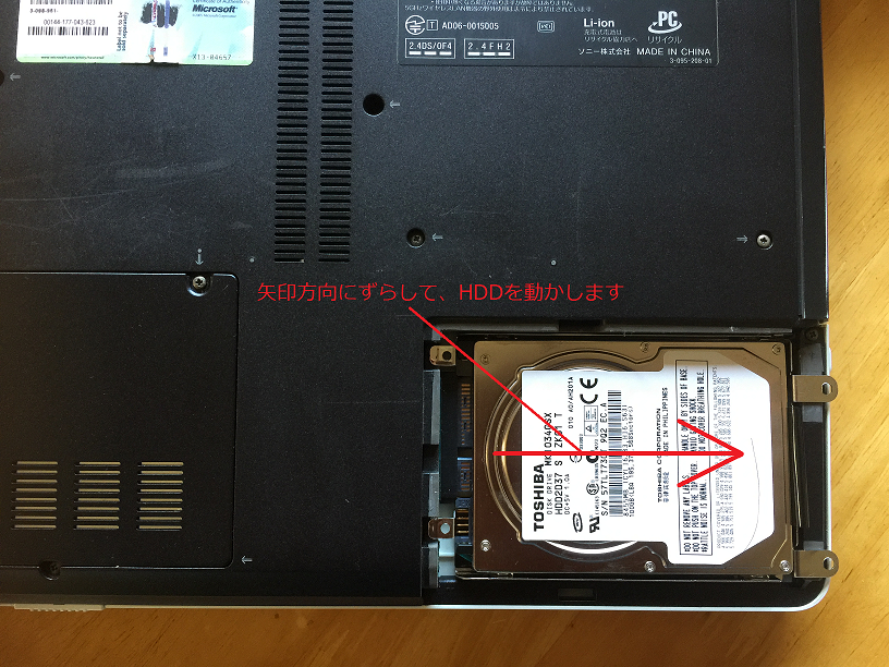 4.ふたを外しますと、今度は内側のネジも外します。(図2)このSonyのノートパソコンの場合は左部分で、プラス(+)ネジ二か所で止められていました。(これも、それぞれのノートパソコンでHDDの止め方はまちまちで、ネジ止めされていないものもあれば、もっと複数個所止められているものもあります)