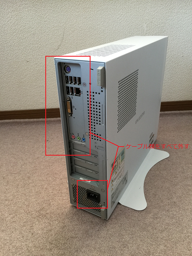 1.まず、デスクトップパソコンの本体に付いている、すべてのコード類を外し、台座が付いているものは台座も外します。(図1、2)