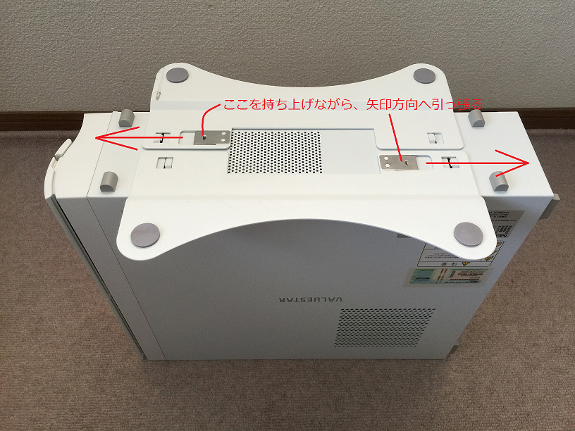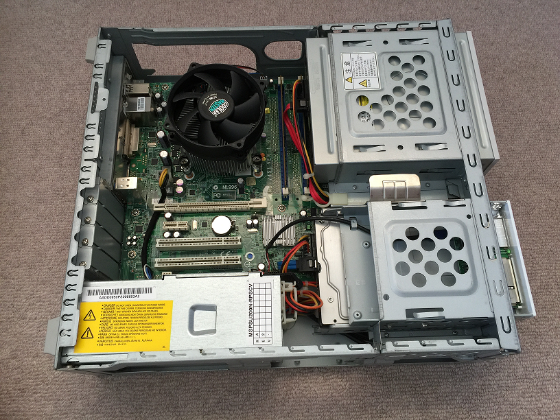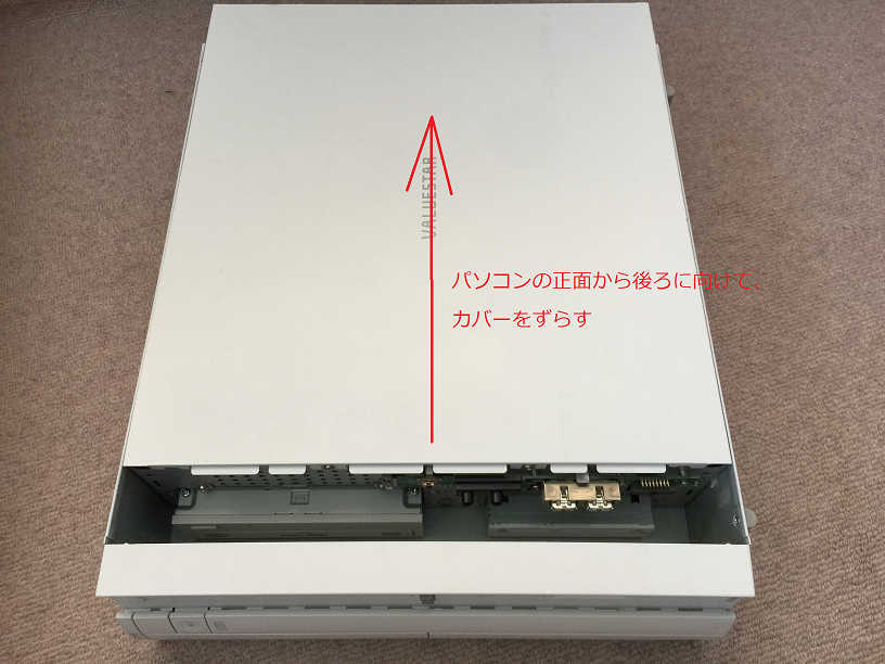 2.次に、カバーを外します。(デスクトップパソコンは、それぞれカバーの外し方が全然違います。ネジ止めされているものもあれば、単純にスライド式で留めてあるものもあります。デスクトップパソコンも、インターネットの検索に“型番+HDD交換”などのフレーズで検索すると、カバーの外し方も含め大抵のものは見つかります)このパソコンの場合は、スライド式です。(図3)スライドをずらした後、前方向からカバーごとずらします。(図4)このように、このモデルは比較的簡単にカバーを取り外すことが出来ます。(図5)