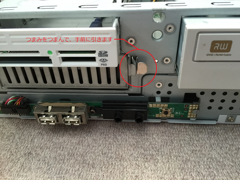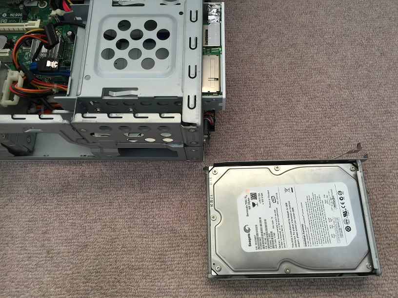 4.そしてケーブルを外したのち、HDDをパソコン本体から取り外しますが、このパソコンの場合は、前面にある留め金を挟んで引っ張れば抜けるようになっています。(図7)(パソコンの種類によっては、ネジ止めされているものもありますし、もう少し陰に隠れている部分にHDDがセットされており、別の部品を一度外さなければHDDを外せない仕様になっているものもあります。これらも、検索で調べられるものが多いと思います)無事に取り外すことが出来ました。(図8)