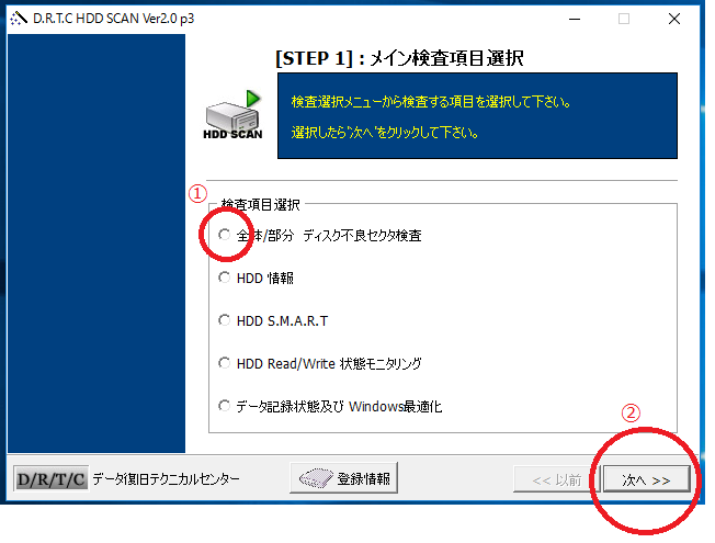 “全体/部分 ディスク不良セクタ検査”の丸ポチにチェックを入れて(①)、“次へ”(②)をクリック