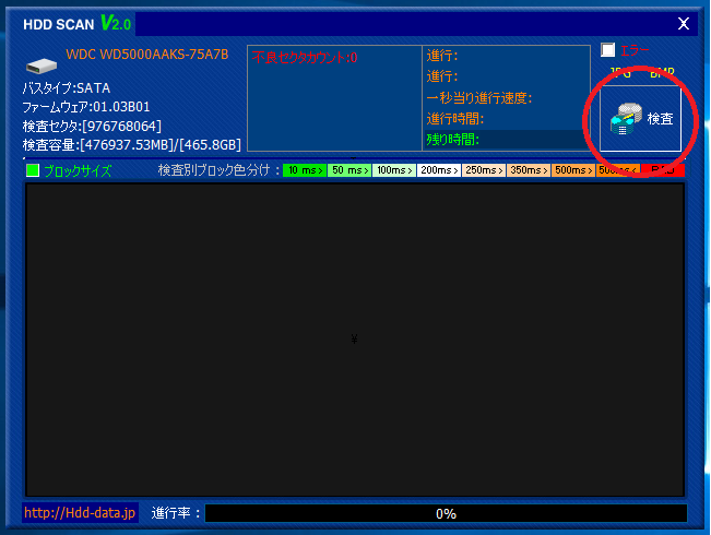 ここで、検査したいハードディスクを選んでクリックすると、図のように黒くなります。↓(①)(因みに、私のパソコンはハードディスクを複数付けすぎです。(笑)普通の人は1つしかありませんからご安心を…)