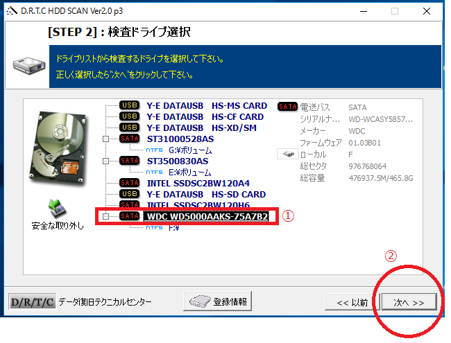 ここで、検査したいハードディスクを選んでクリックすると、図のように黒くなります。↓(①)(因みに、私のパソコンはハードディスクを複数付けすぎです。(笑)普通の人は1つしかありませんからご安心を…)