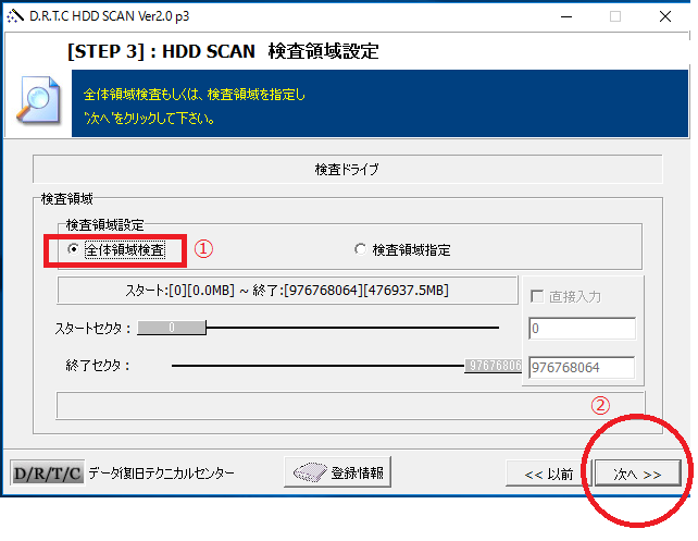 “全体領域検査”の丸ポチにチェックを入れて(①)、“次へ”(②)をクリック